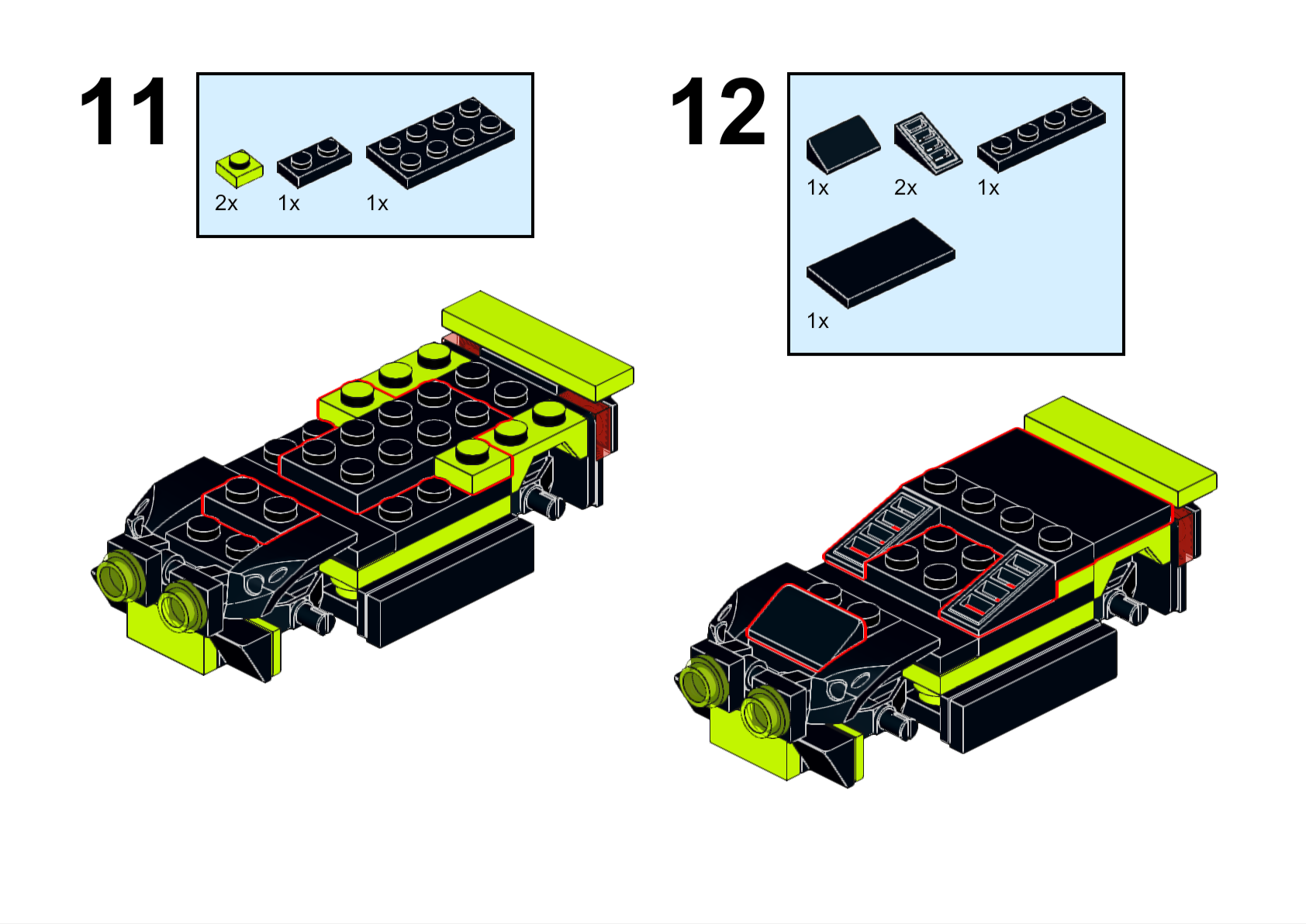 OK, here's why I brought up the Power Miners plate earlier: See that 1x4 lime plate in Step 9? For my model, I used the one from the Tiny Turbos model 8133, Rally Runner. That piece also has, you guessed, it, a sticker with the number 2! (Also, I literally didn't realize until now that I gave this model the same name as a Tiny Turbos original. Heck, they're both lime. Seriously, people, send me your alternate name ideas; I'm drowning in embarrassment here.)